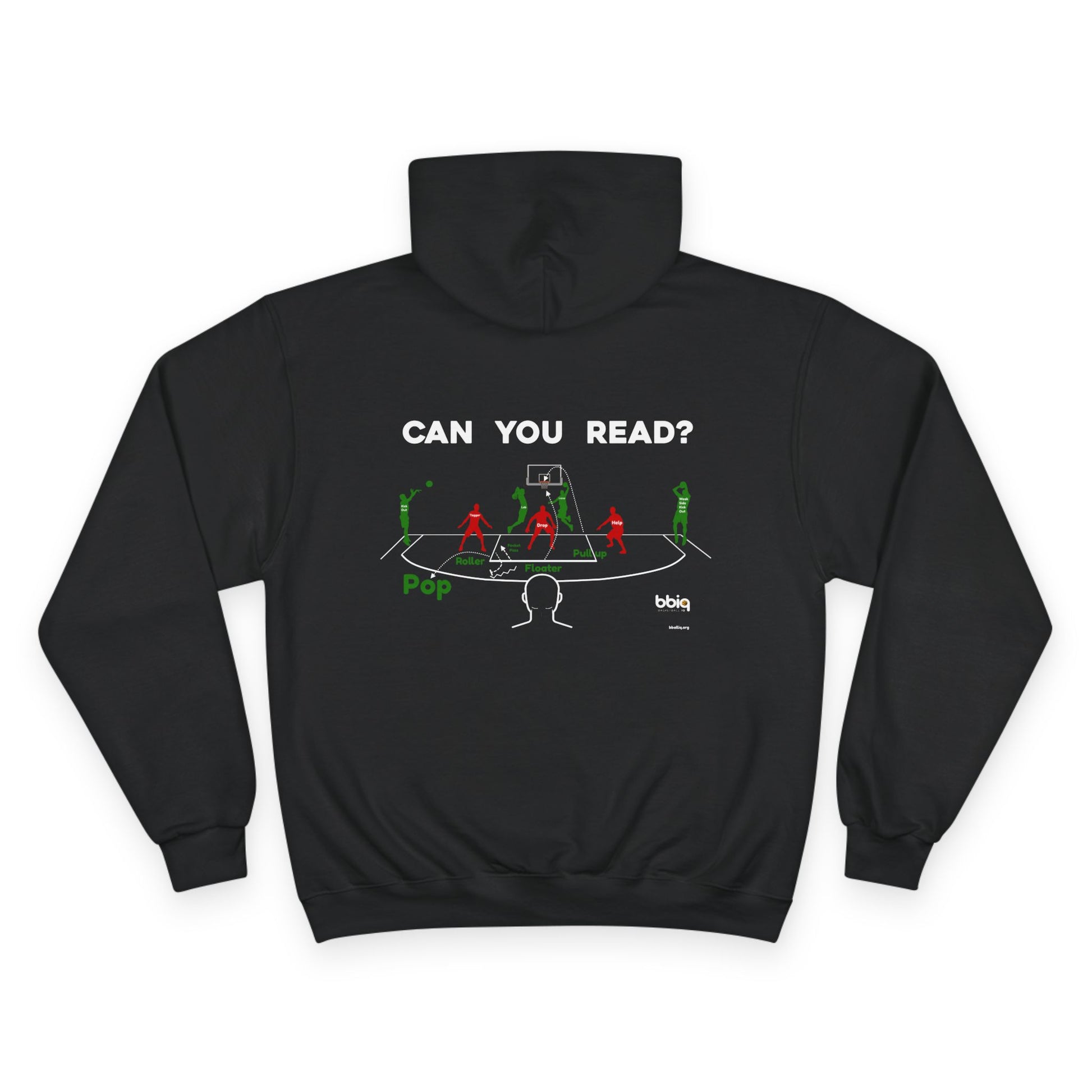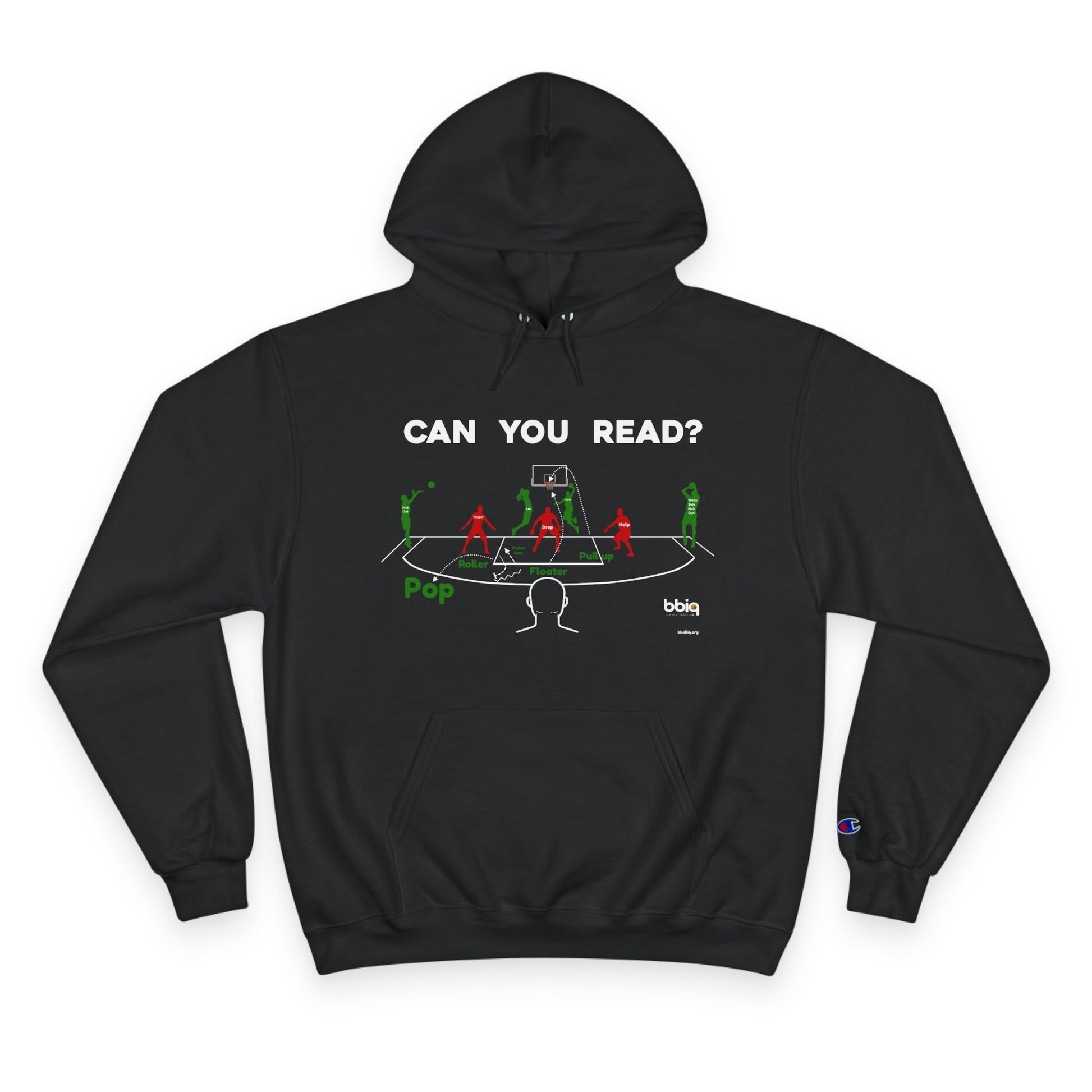 Can you read? Champion Hoodie for the point guard or wing decision maker in your life. Released by the American heritage brand, Champion, this eco hooded sweatshirt is ideal for customization. It features Champion’s Double Dry® technology - keeping the wearer warm and toasty. It is a medium-weight two-ply fleece hoodie in a regular fit with a spacious pocket. The hoodie has the iconic "C" logo on the left sleeve and is made of up to 5% recycled polyester from plastic bottles.